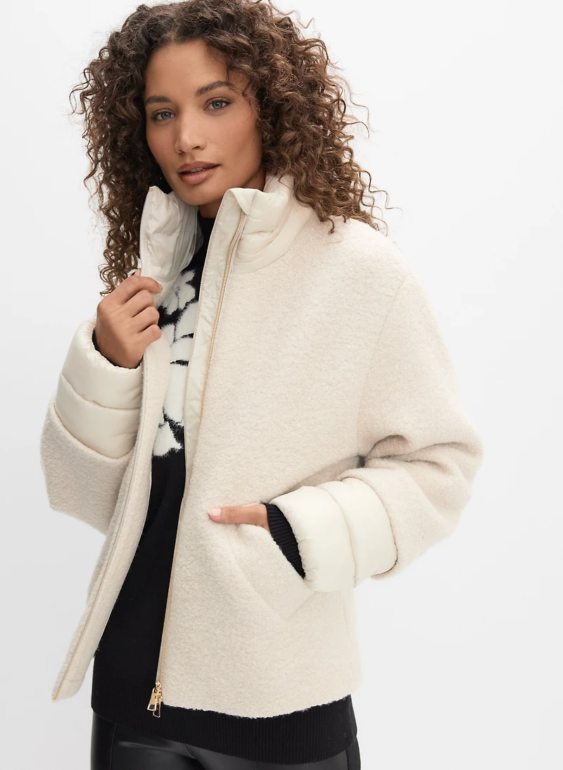 Our short coat offers a tactile contrast between its boiled wool exterior and quilted nylon details—the perfect contrast for a chic and athletic look.