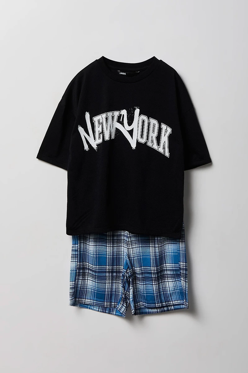 This 2-piece set comes with a top featuring graphic front, crew neck, short sleeves, and a matching short featuring all-over print and elastic waist.
