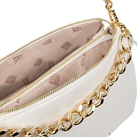 Man-made material SM logo printed pattern body Silver hardware drop chain Detachable small circular pouch Adjustable crossbody strap Multiple interior compartments with double zipper enclosure 11" long x 8.5" high x 4" wide Strap drop length: 22" Imported