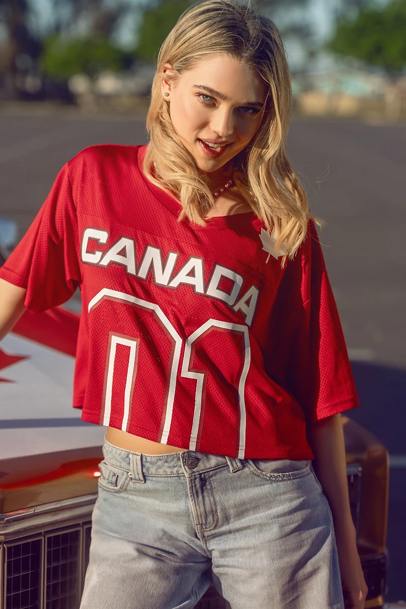 This jersey features mesh material, graphic front, V-neckline, short sleeves, and cropped hem.