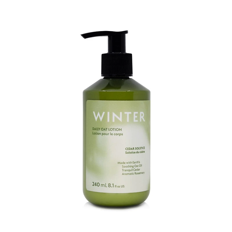 A daily lotion for all skin types, in our limited-edition Winter scent.  Cedar Solstice is inspired by the forest, blending the rich, tranquil aromas of cedarwood with the fresh, aromatic notes of rosemary.  Made for all skin types, this lotion is formulated with soothing oat oil and moisture-rich shea butter to leave your skin soft and smooth with a non-greasy finish. We call it 'Daily 'because that’s exactly what it is—a lotion that fits seamlessly into your daily routine. Lightweight and fast-absorbing, this balanced formula spreads easily and delivers long-lasting hydration that keeps your skin comfortable from day to night.   We chose oat oil as a key ingredient because it’s naturally rich in ceramides and antioxidants—great for locking in moisture, soothing dryness, and supporting your skin’s natural barrier. It’s also gentle enough for all skin types, including sensitive skin. KEY INGREDIENTS AND BENEFITSSoothing Oat Oil – Calms and comforts dry skinTranquil Cedar - Calms the senses with its warm, woodsy aroma.Aromatic Rosemary - Refreshes and clarifies with a bright, herbal scent. Scent: Cedar Solstice Pair with the Cedar Solstice Everything Wash for a 2-step cleansing routine for hydrated hands. Explore the entire Cedar Solstice Collection OUR SUSTAINABLE JOURNEY IS EVOLVINGWe’re moving away from virgin plastic by using bottles, pumps, and caps made from Post-Consumer Recycled (PCR) plastic. PCR plastic is made from recycled materials—giving them new life and keeping them out of landfills. Our labels are made with Forest Film, a renewable material sourced from sustainably managed forests. To learn more or find recycling info, visit the Sustainability tab above.