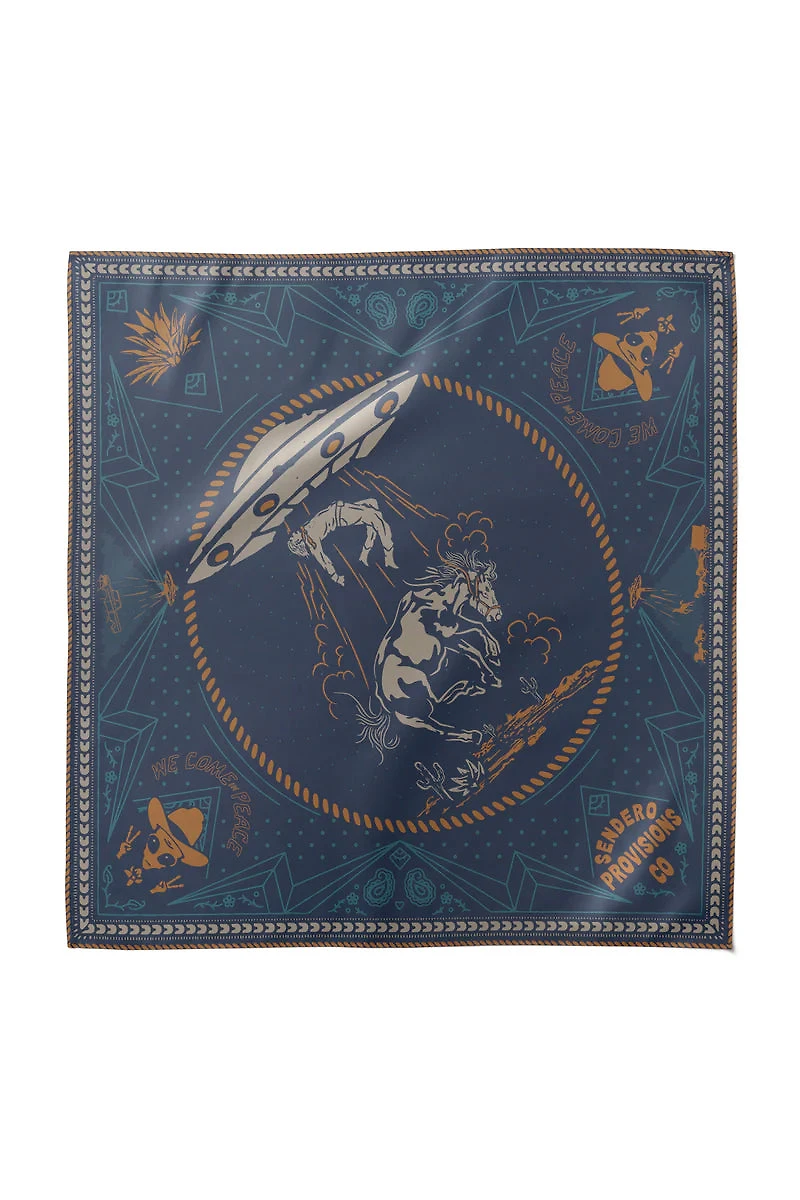 A little western, a little out there. The Charros & Aliens Bandana features a bold graphic of a cowboy abduction scene with vintage-inspired details and contrast border print. Lightweight and versatile, it’s the kind of piece that instantly adds personality to any look.