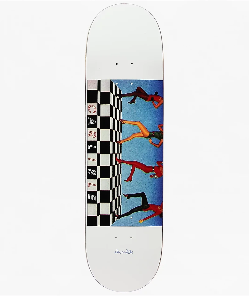 The Carlisle Aikens Chocolucci 8.5" deck from Chocolate brings a disco-inspired dance scene to a classic checkerboard backdrop. Constructed from durable 7-ply North American maple, the deck uses a G053 shape and includes subtle embossed tail branding