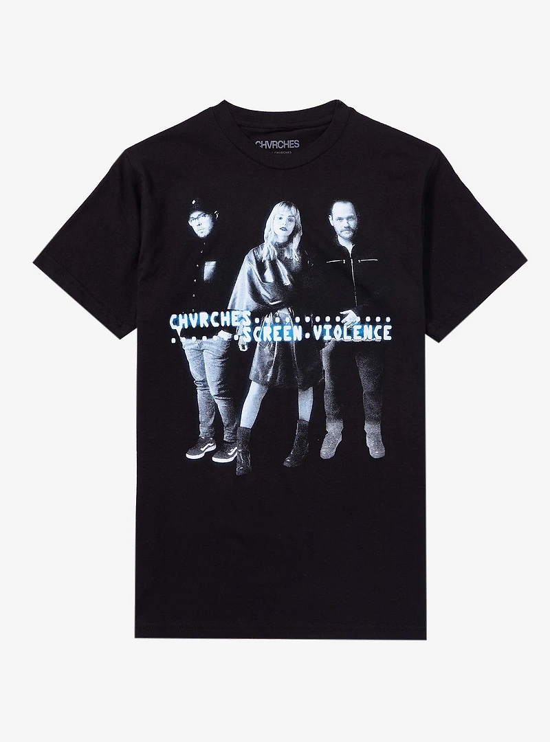 Good girls wear Chvrches tees. This one features a monotone group shot of the band with "Screen violence" printed across the chest. Please note: Style runs large; size down for a tighter fit.