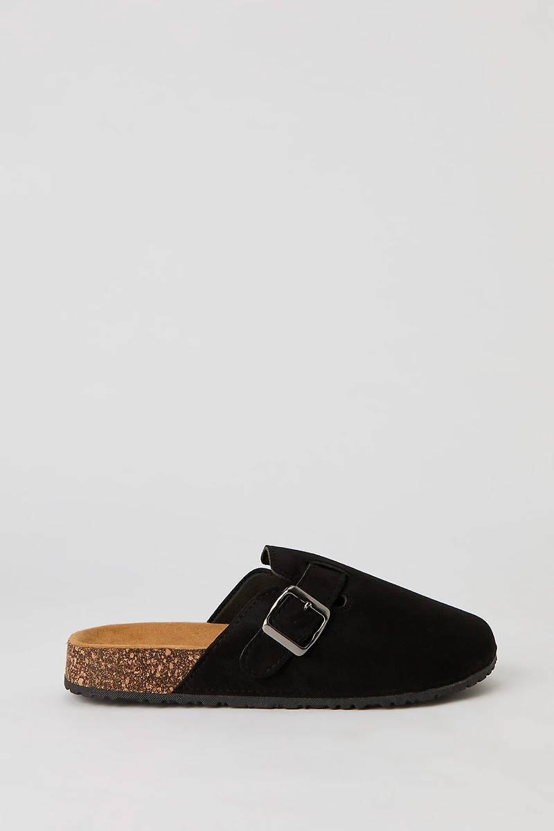 This shoe features faux-suede material, buckle, cork sole, and slip-on design. Pictured Size: 9 Imported