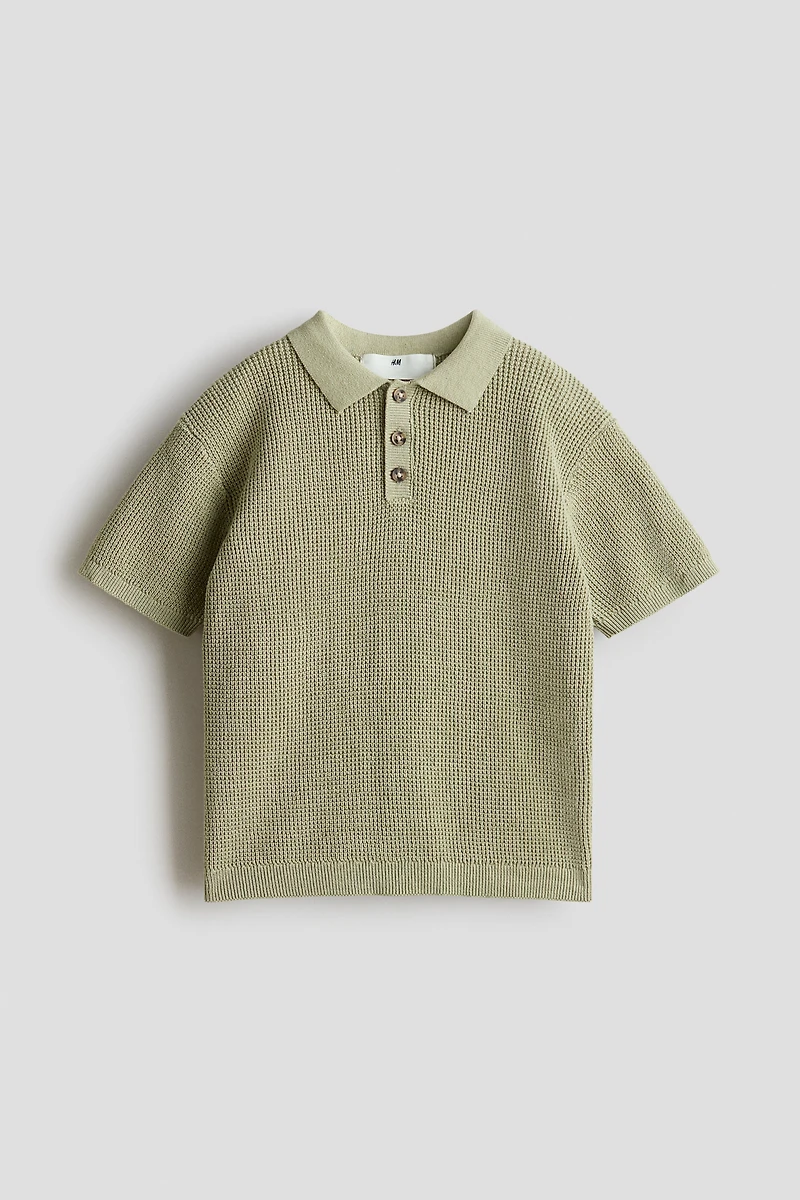Knit polo shirt in soft cotton. Flat-knit collar, button placket, dropped shoulders, and short sleeves. Ribbed cuffs and hem.