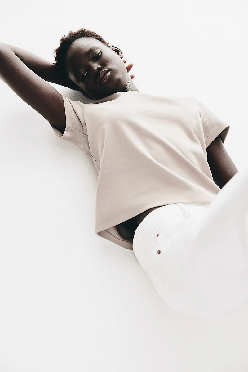 T-shirt in densely woven cotton jersey with a round, ribbed neckline.