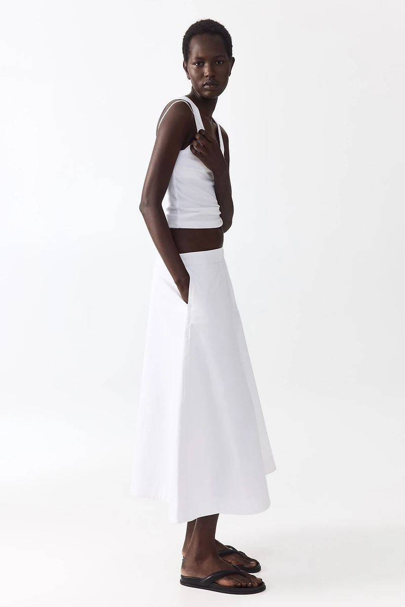 Loose-fit, calf-length, A-line skirt in cotton twill. High waist, concealed zipper at one side with hook-and-eye fastener, and discreet side pockets. Unlined.