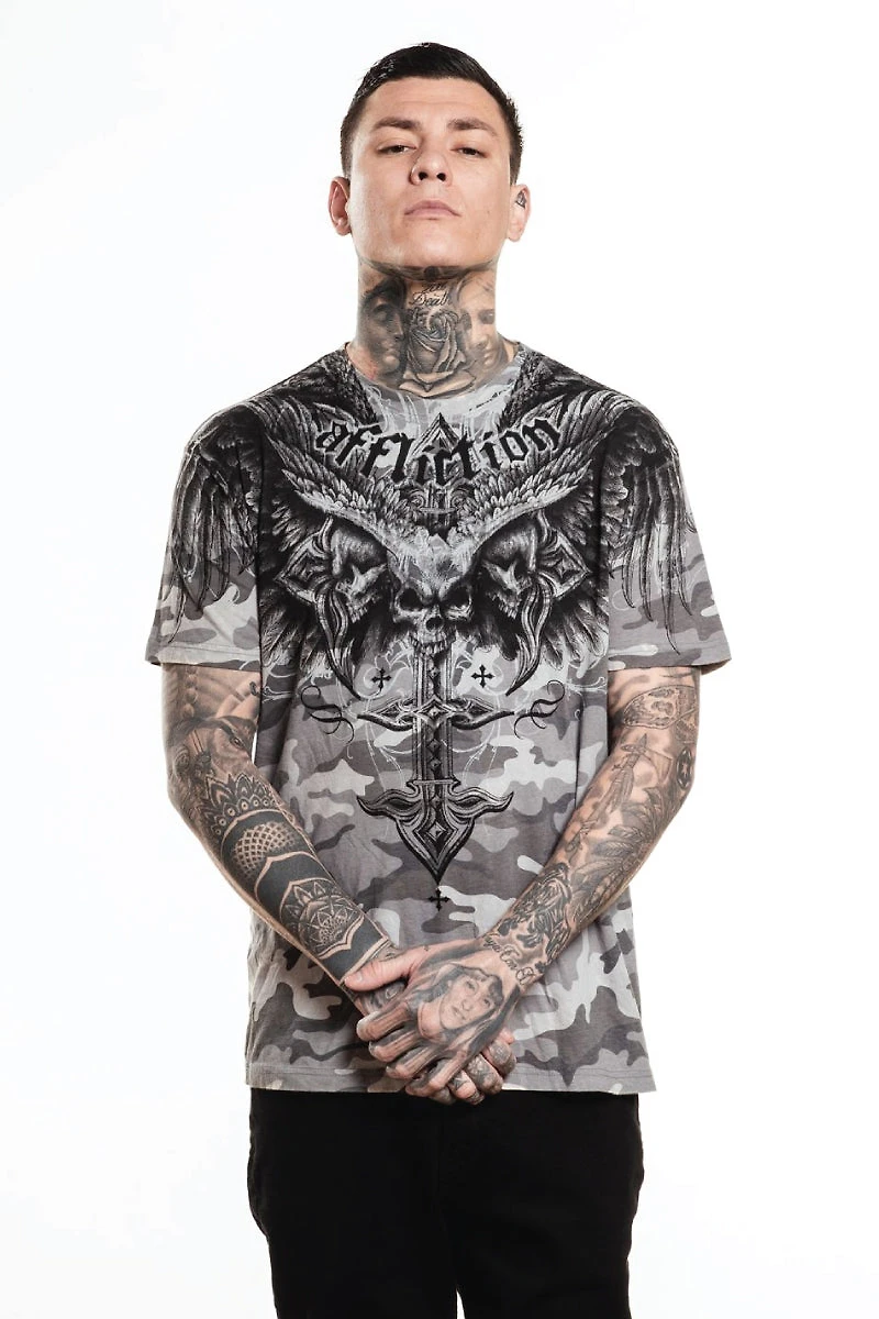 With an all-over camo, Death Eyes Tee features Affliction's signature artwork of skulls and wings.