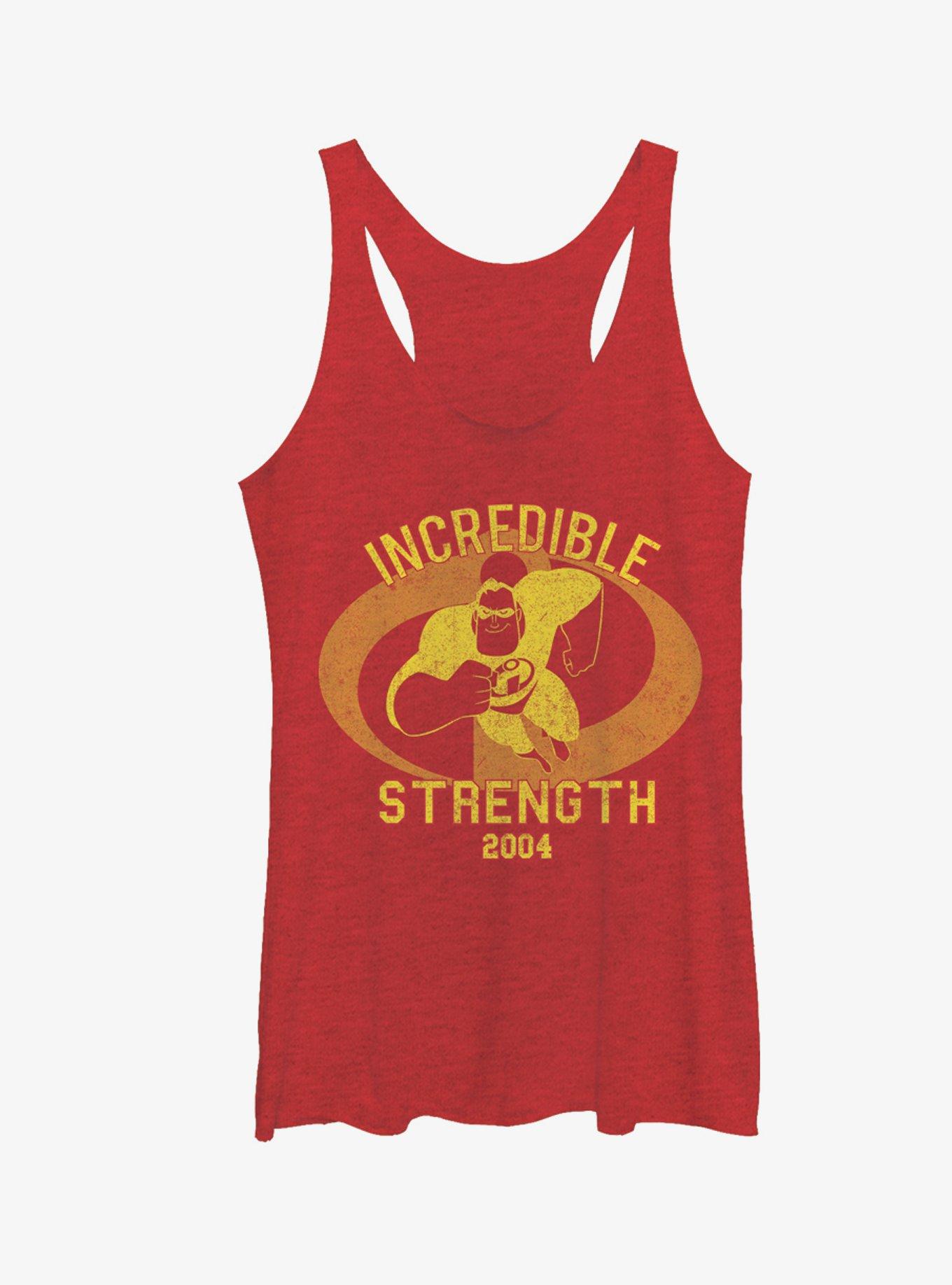 Head to the gym and become your own superhero with the Incredibles Strength 2004 Heather Red Racerback Tank Top! Mr. Incredible makes an appearance in a distressed yellow print that reads "Incredible Strength 2004" on this fun red Incredibles tank top that is perfect for your incredible workouts! 50% Polyester, 25% Cotton, 25% Rayon.