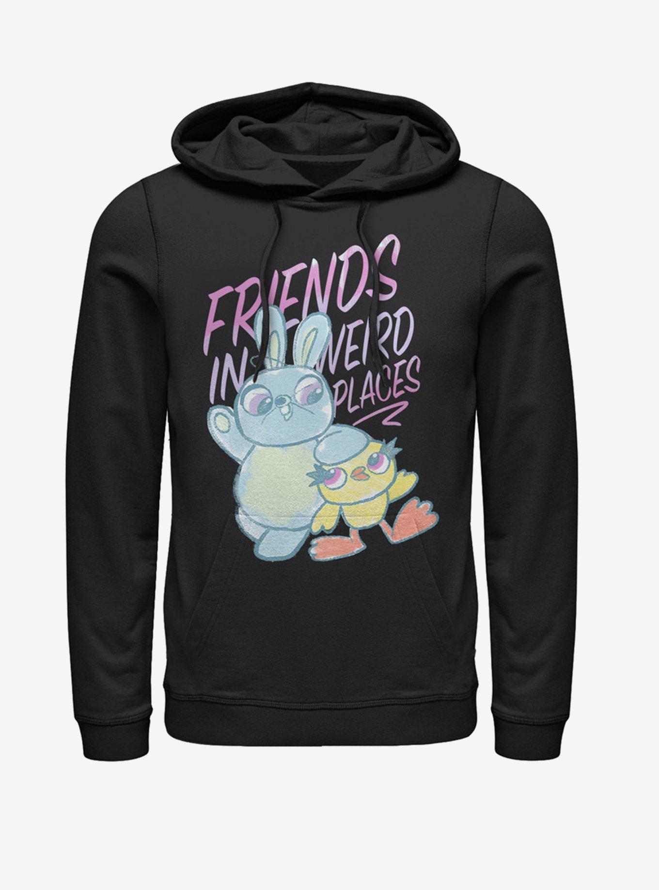 Stay weird! Bunny and Ducky from Toy Story 4 appear on the front of this pullover black hoodie that says, "Friends in weird places."