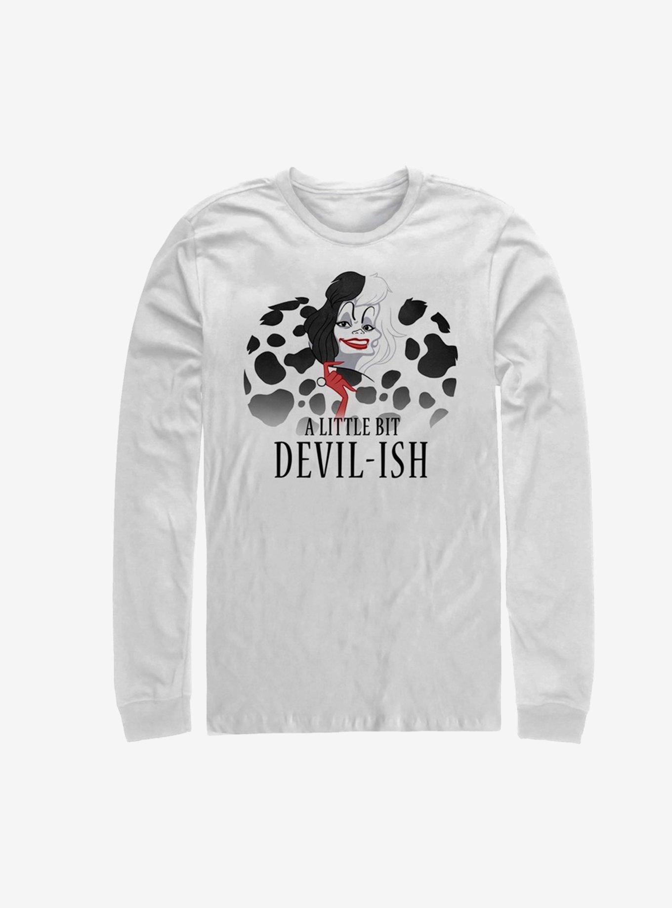 I live for furs! I worship furs! After all, is there a woman in all this wretched world who doesn't? When it's not quite cold enough to wear your favorite fur coat, put on this long-sleeve tee from Disney featuring Cruella de Vil and "A little bit devil-ish" text below.