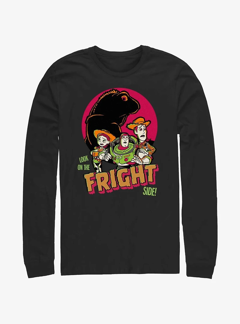 Always look on the fright side! This long-sleeved tee features Jessie, Buzz Lightyear and Woody from Toy Story being terrorized by Mr. Jones the iguana.
