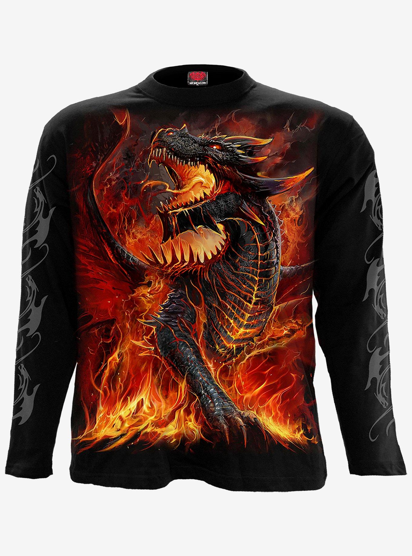 Wings of charred sulphur envelope the heat burning from within this dragon?s belly. Molten lava seeps from every crack along her body, dripping to the ground where furious flames whip and lick at her feet. This longsleeve t-shirt is made of top quality cotton jersey using skin friendly, Azo-free, reactive dyes. Item cannot be shipped to P.O. Boxes
