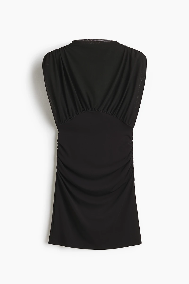 Short, fitted sleeveless dress with a draped upper section in mesh and lower section in thick interlock jersey. Stand-up collar, gathers on shoulders and below bust, and gathered side seams. Lined.