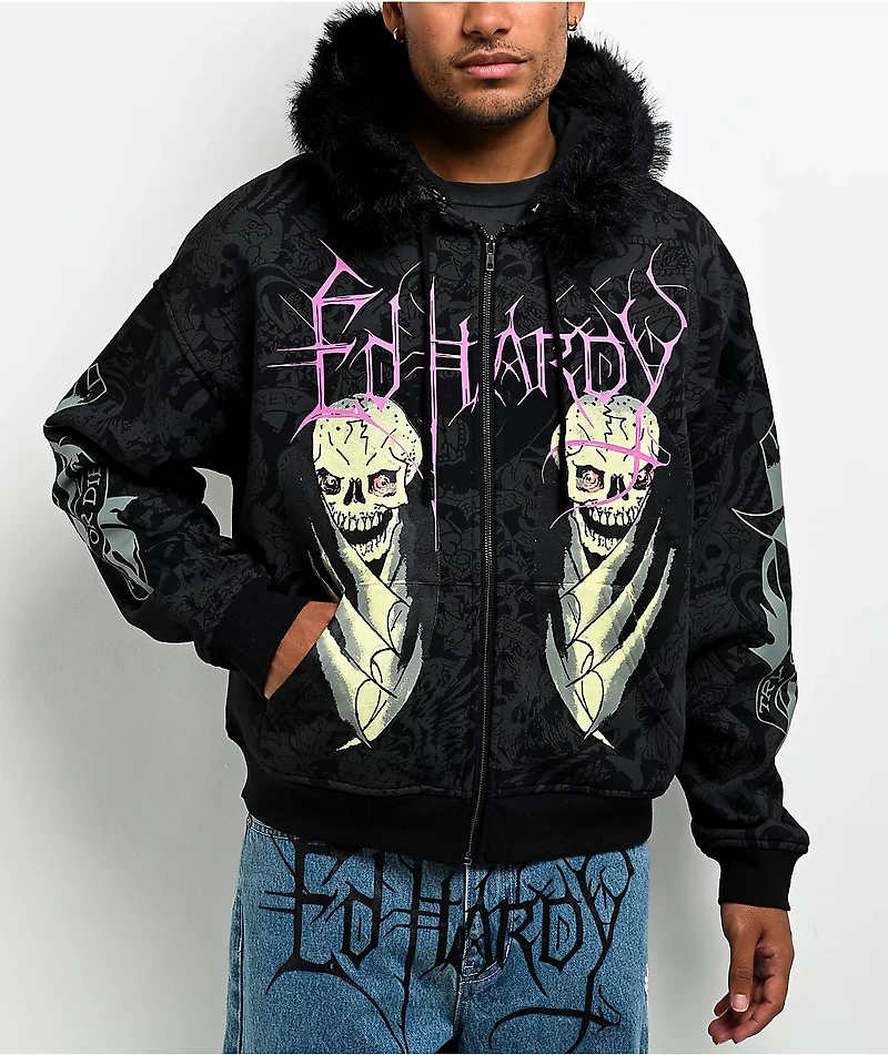 Ed Hardy Bat Skull Faux Fur Black Zip Hoodie