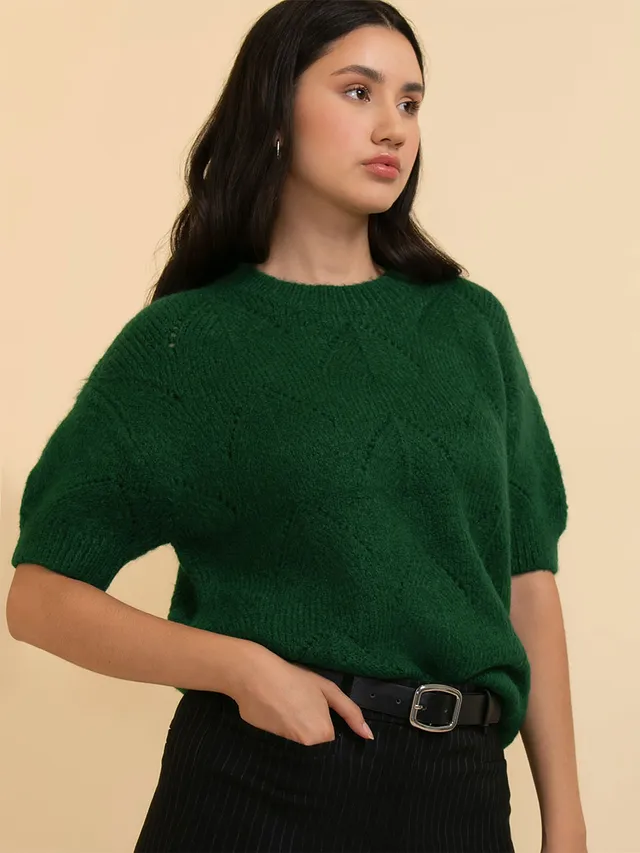 Pointelle Pullover Short Sleeve V-Neck Front Tie Sweater