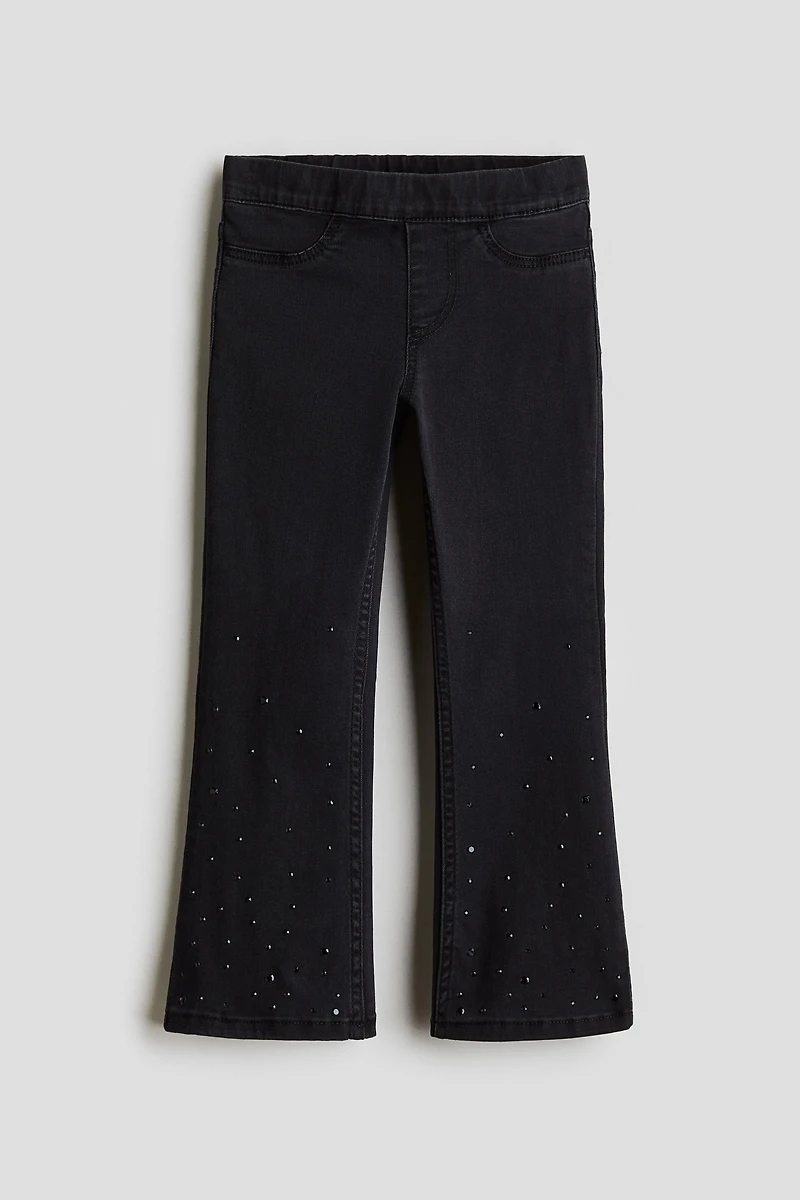 Jeggings in soft denim with embellishments. Covered elastic at waistband, mock fly, decorative front pockets, and open back pockets. Long legs with flared hems.