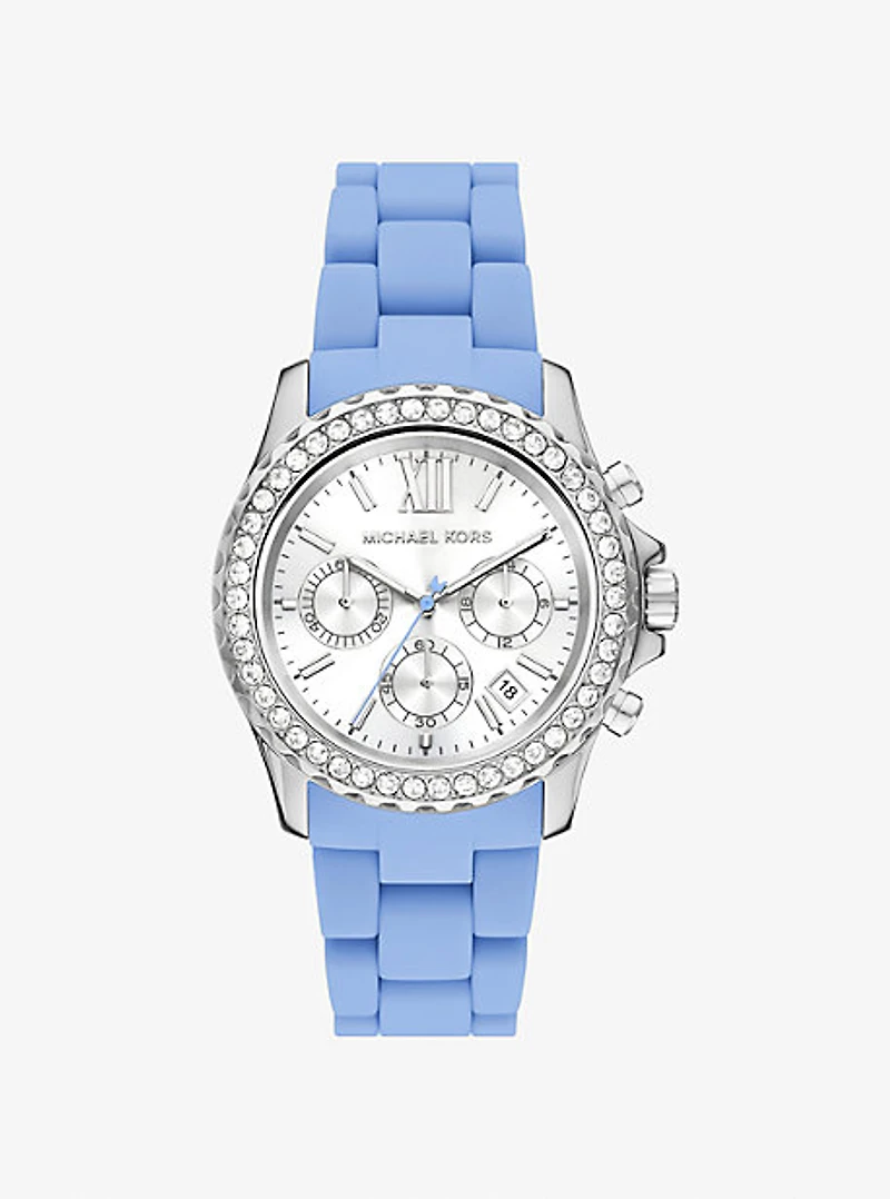 Watch, stainless steel/silicone, silver-tone hardware, pavé topring, 40mm case, quartz/chronograph movement, clasp fastening, water resistant up to 5 atm, 2-year warranty, imported