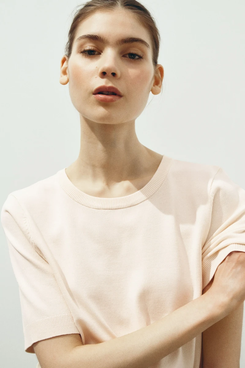 Short-sleeved top in a fine-knit viscose blend. Ribbing at neckline, cuffs, and hem.