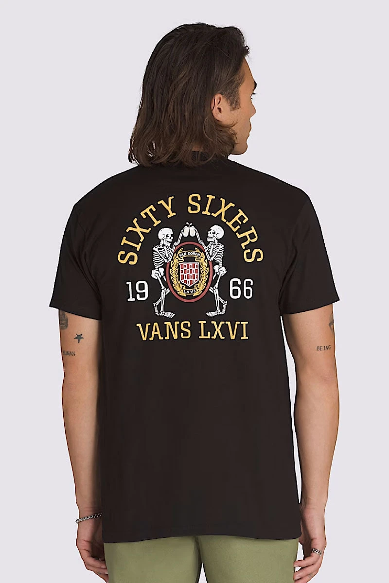 The Frat LXVI Tee pays homage to 1966. Featuring a screenprinted graphic of the Vans origin date on the front, and the same on the back accented with skeletons toasting brews over a collegiate shield.