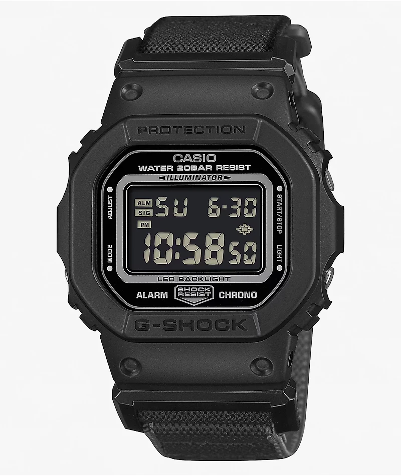 Lightweight, durable, and sophisticated, the square DW5600MNC-1 digital watch from G-Shock is available in a versatile black and grey color scheme with a special FIDLOCK® magnetic closure on the stretchy polyester strap for easy on and off. Built