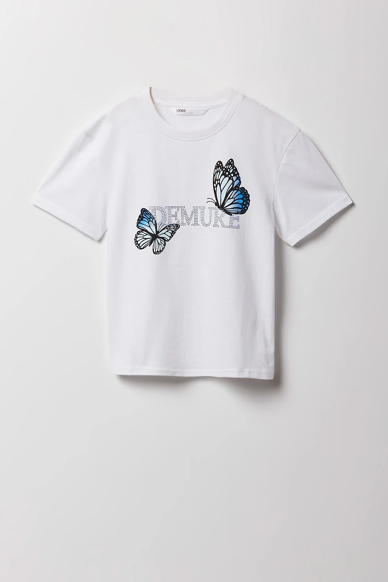 This top features graphic front, rhinestone text, crew neckline, and short sleeves.