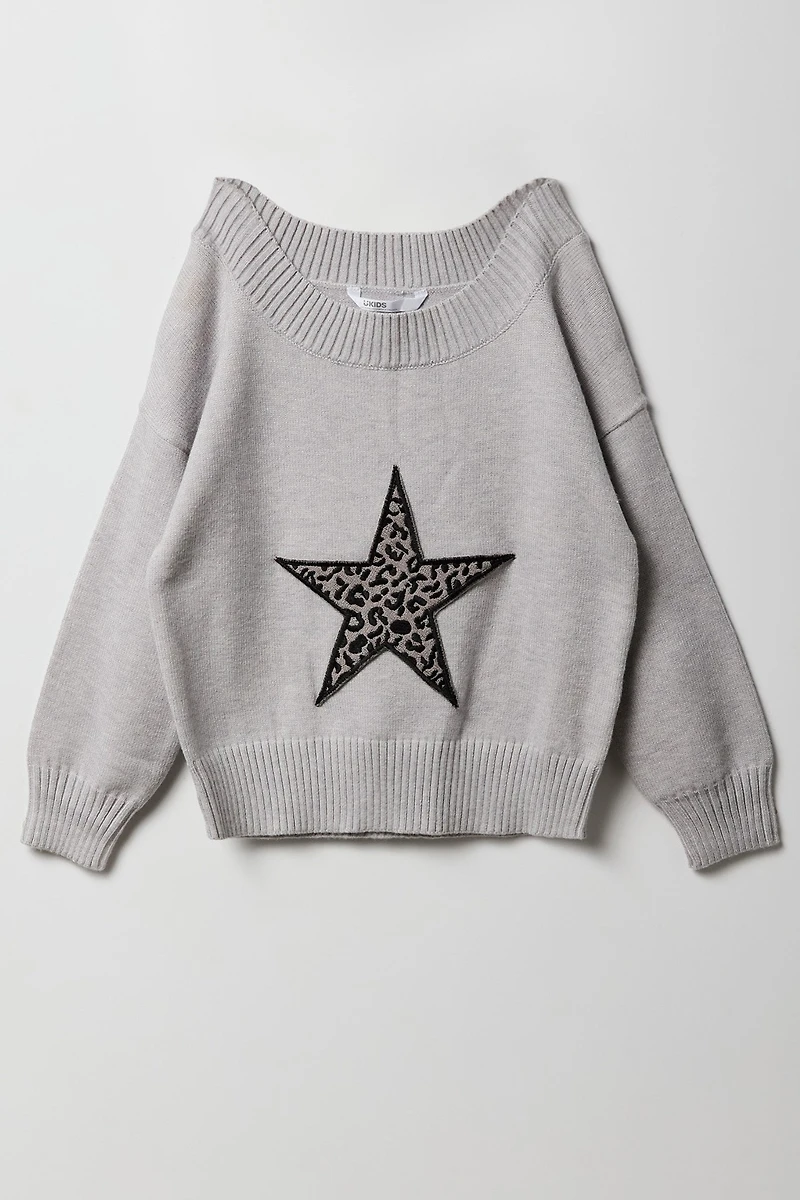 This sweater features jacquard knit material, boat neckline, long sleeves, and ribbed knit trim.