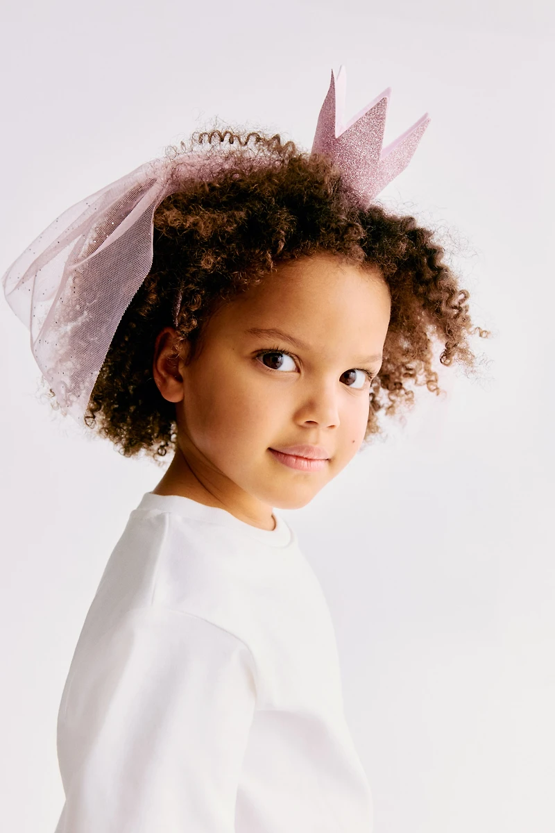 Glittery costume hairband with a crown and a tulle veil.