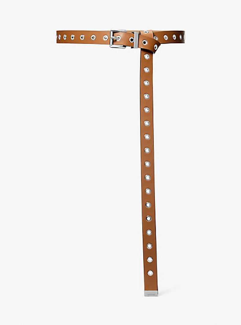 This eye-catching belt packs a textural punch with smooth leather and metallic grommets. Its elongated design is intended to be looped through once and left to fall vertically for added drama. We love it cinched over a blazer or breezy maxi dress.