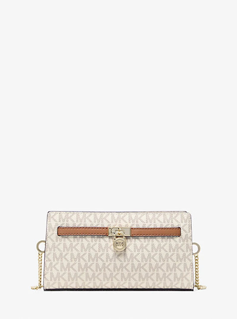 A wallet so chic and sophisticated, you’ll want to wear it alone. Inspired by the brand’s most beloved bag, the hamilton moderne reimagines classic money pieces with a signature logo-print finish, gleaming belted padlock and chain-link detail. Wear it by the detachable crossbody strap for on-the-go style or toss it into the matching tote bag as an everyday essential.