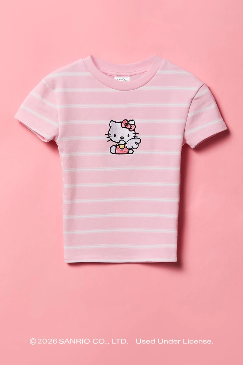 This t-shirt features embroidered front, all-over stripes, crew neckline, and short sleeves.