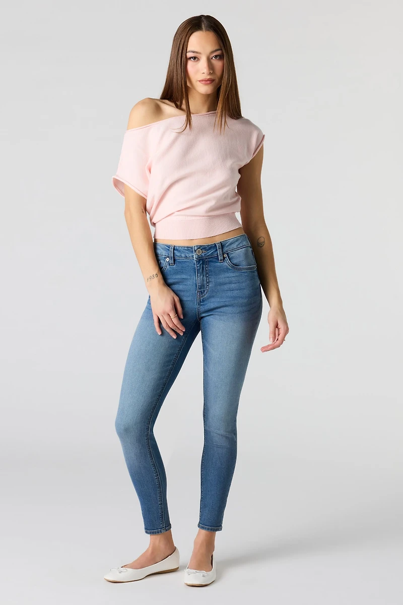 This jean features denim material, high-rise waist, 5 pockets, zip-fly button-up closure, belt loops and skinny leg.