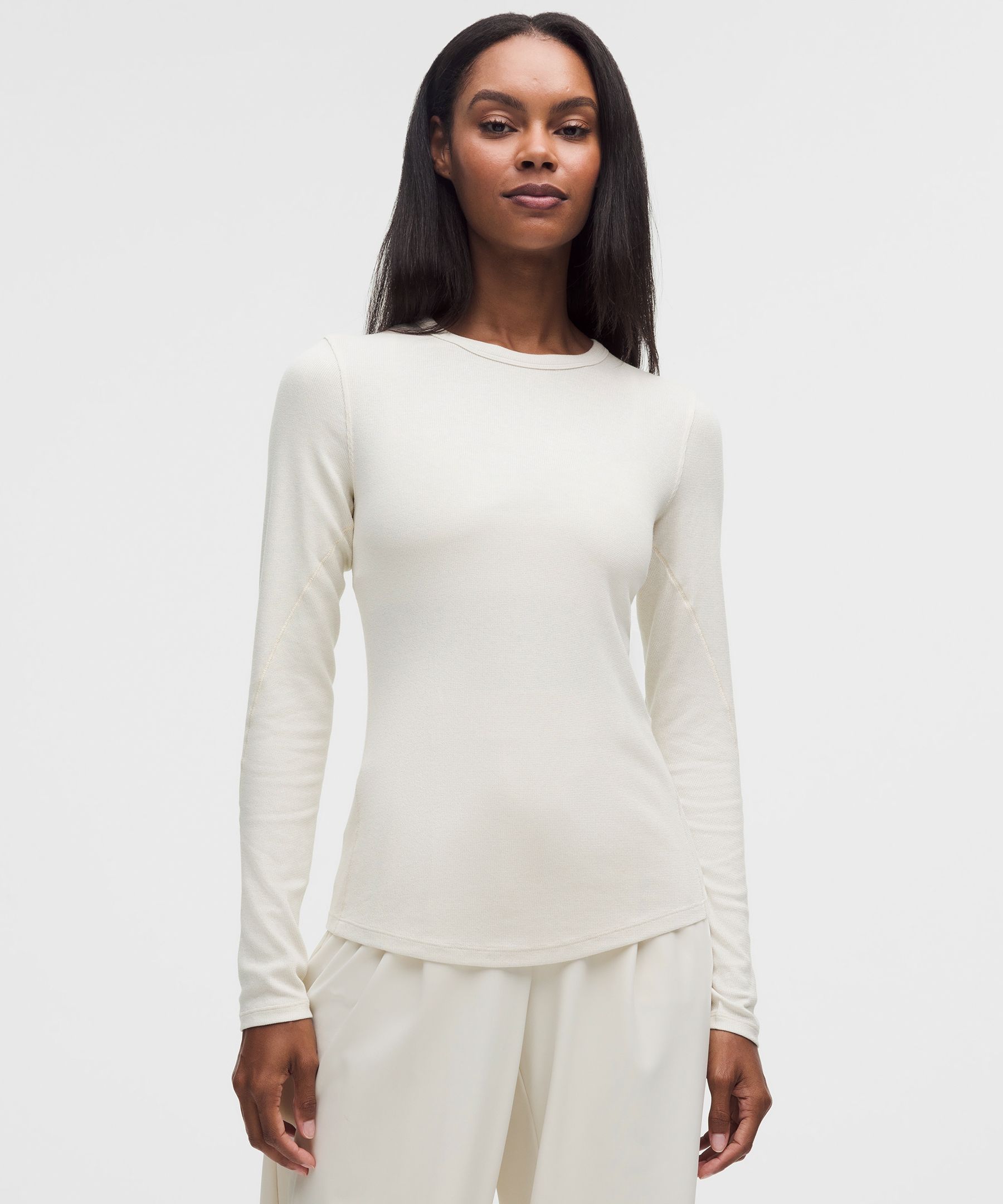 Super soft and loves to layer. This lightweight long sleeve delivers just-right stretch and a second-skin fit that wears well on its own or as a base. Metallic yarns add a little sparkle.