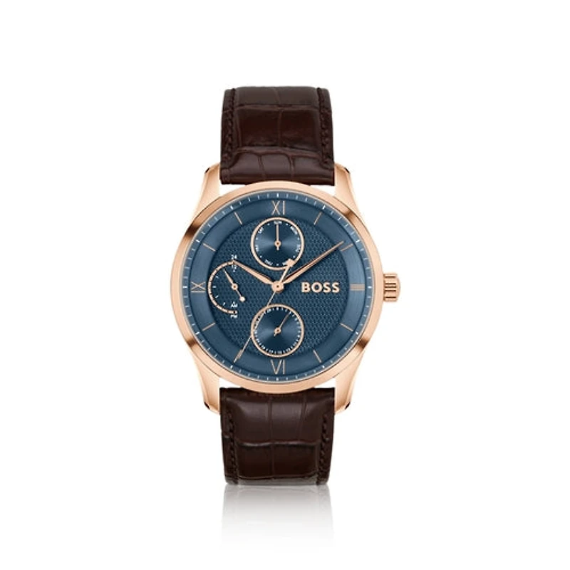Elevated by a textured blue dial, this BOSS Menswear watch is crafted in luxe gold-effect steel. Brown leather strap with crocodile embossing. Multifunction movement.