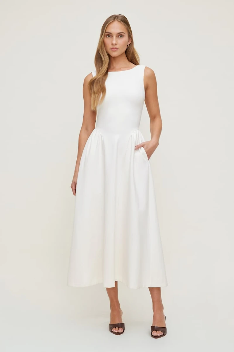 This maxi dress is made from heavyweight ponte with a soft, stretchy handfeel for a sculpting look that hugs you in all the right places. It's fitted at the bust and flares out at the waist for a flirty and flouncy feel. Pair it with a
