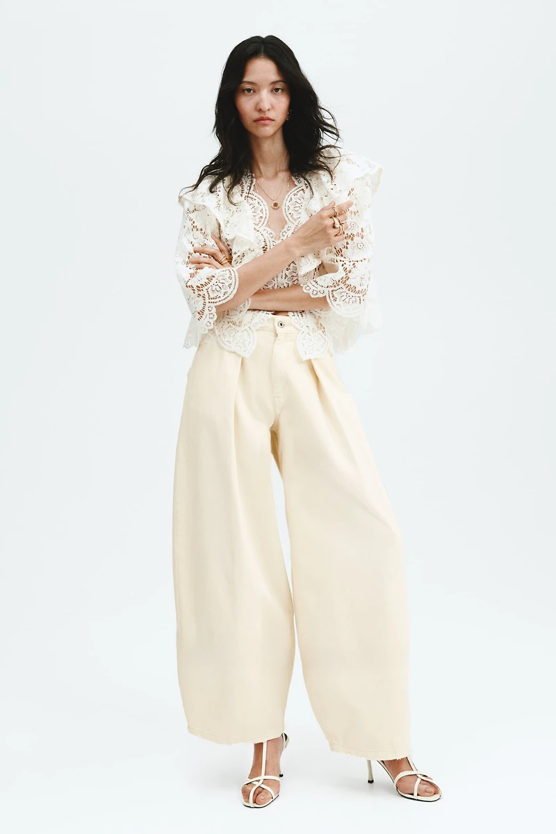 Jean 5 poches en denim de coton rigide qui peut paraître ferme au départ, mais qui s'assouplit et se relâche avec l'usage. Coupe flottante des hanches jusqu'aux cuisses avec jambes volumineuses et incurvées, s'effilant vers l'ourlet. Modèle avec taille de hauteur classique et braguette à fermeture éclair surmontée d'un bouton. Plis devant et finition frangée en bas de jambe. Longueur classique, conçue pour tomber juste au-dessus du pied sans surplus ou presque.