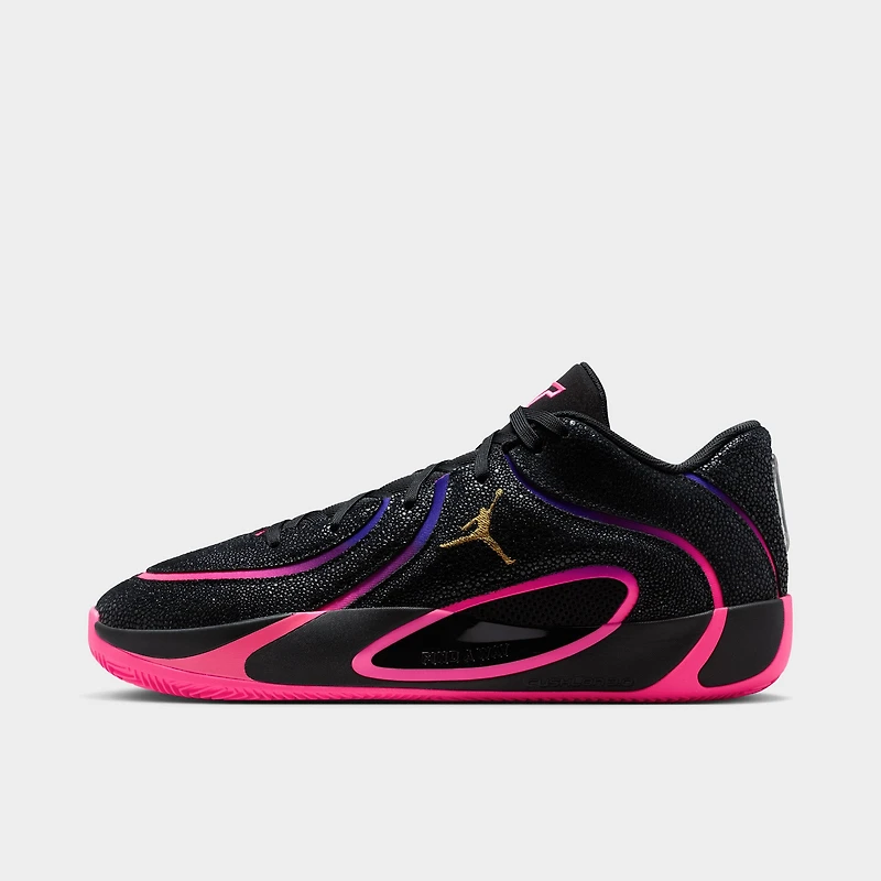 Black pebbled upper delivers durable support with a textured finish Neon pink, purple and blue gradient details add bold, expressive energy Gold Jumpman on the lateral side brings a premium contrast hit Black suede tongue with matching JT logo locks in signature style Bright pink rubber outsole provides traction with standout colour Built for players who like their game loud and their style louder, the Jordan Tatum brings serious attitude to every step. With a striking neon gradient and a clean gold Jumpman accent, this pair blends performance-ready design with statement-making colour for the court and beyond. Product code: IR0073-003