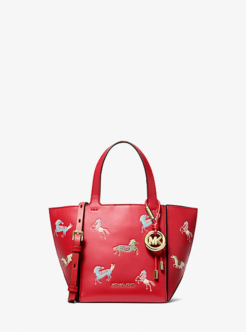 Our jordi tote takes center stage as we enter the year of the horse. The quintessential grab-and-go bag, it’s crafted from vibrant, crimson-hued leather that's printed and embossed with a charming and colorful horse motif. Designed with top handles and a crossbody strap for maximum versatility, it also folds flat for travel and storage. Make it your must-wear accessory for the holidays.