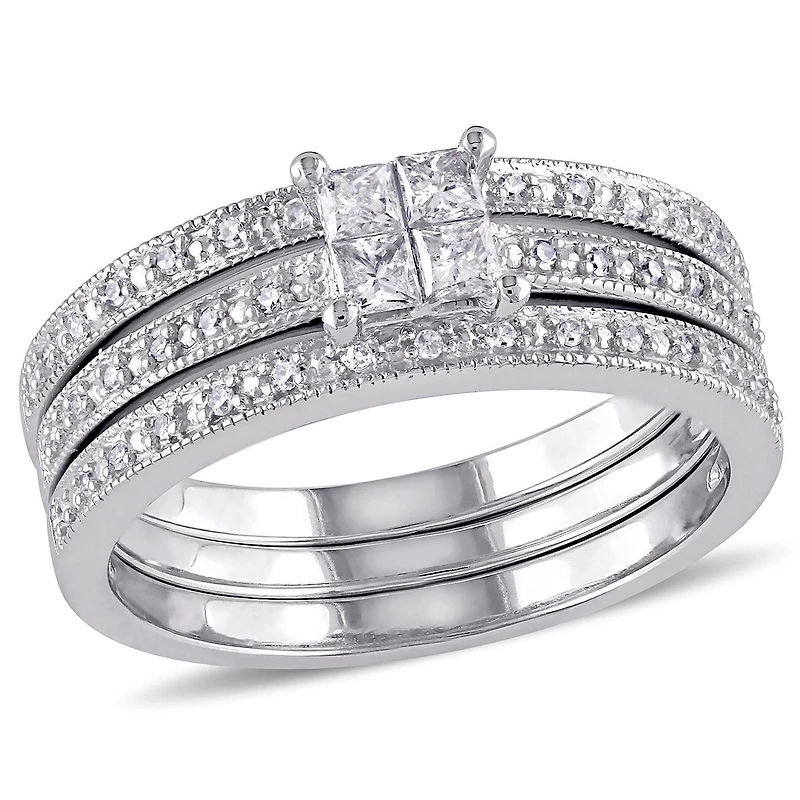 This traditional Diamond Bridal Ring Set is the perfect choice for your beloved one. Crafted in white gold, 4 sparkling princess-cut, invisible-set white diamonds (G-H, I2-I3) graces the center of the engagement ring, while a total of 12 round-cut, pave-set white diamonds (G-H, I2-I3) are shimmering along the sides. The companion two wedding bands have a total of 30 round-cut, pave-set white diamonds (G-H, I2-I3) for a perfect match. This ring is enhanced with a high polish finish and will lend an eye-catching touch of sparkle to your bellowed one's look.