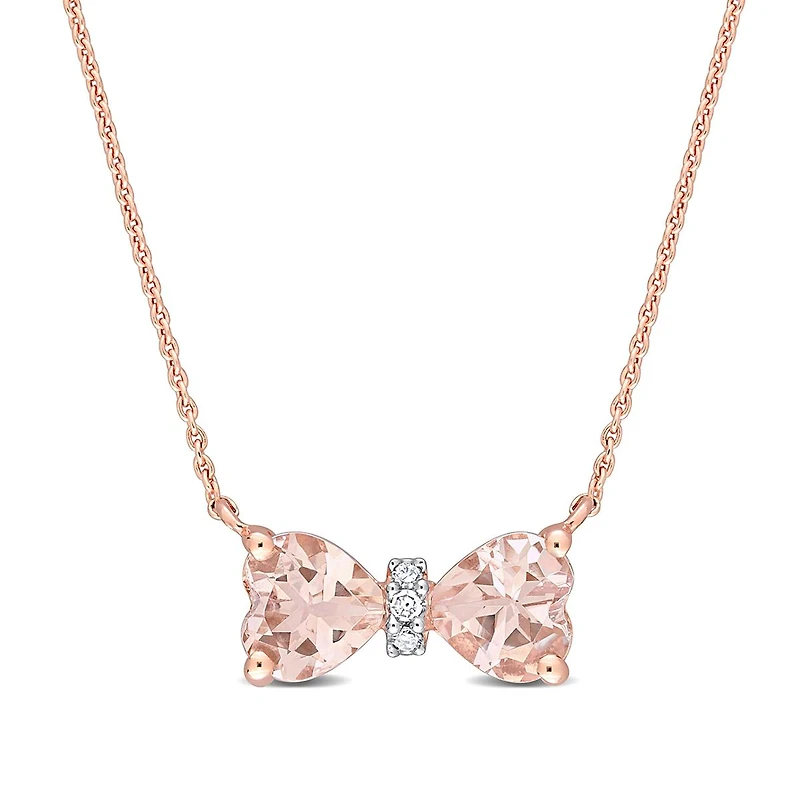 This exquisite bow necklace is crafted in glistening 10-karat rose gold. This charming necklace showcases two heart-cut, prong and channel-set morganite gemstones and three round-cut, buttercup-set diamonds arranged in a bow like pattern. Polished to a brilliant shine, this flawless necklace is suspended on a 17-inch round cable chain. Compliment this ravishing necklace with a pair of bow earrings for a complete look.