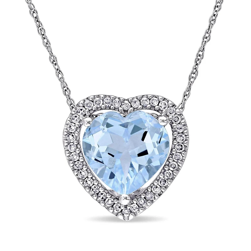 This shimmering heart necklace features a heart-cut sky blue topaz stone surrounded by a halo of 36 round buttercup white diamonds set in 10-karat white gold. This pendant is hung on a rope chain and is secured with a spring ring clasp.