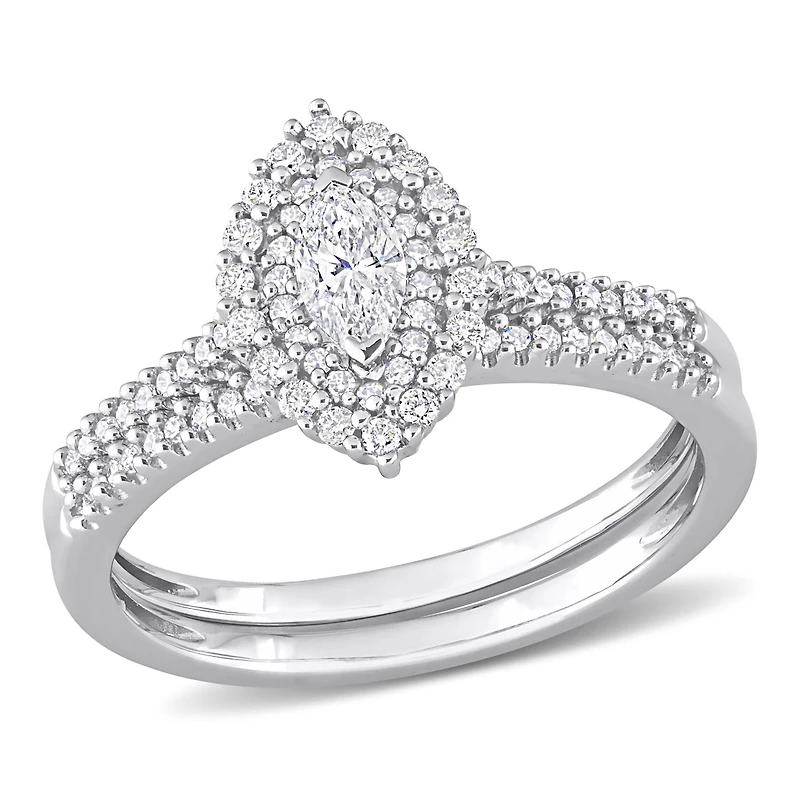 This stylish marquise halo double band ring is crafted in glistening 14-karat white gold. This sumptuous ring showcases a marquise-cut, prong-set diamond at the center surrounded by 18 round-cut, prong-set and 60 round-cut, buttercup-set diamonds arranged in a halo pattern and sliding half way down the two bands. Enhanced with a high polished finish, this ravishing ring is perfect for the woman who likes to leave an everlasting impression.