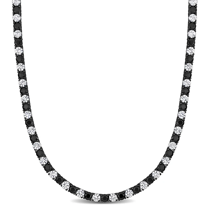 The Men's 36 CT TGW 4mm Round Created Black & White Sapphire Necklace with Box Clasp, a romantic and sophisticated piece that masterfully blends timeless elegance with contemporary style. This exceptional necklace is expertly crafted in white and black rhodium-plated sterling silver, providing a versatile and unique touch to any gentleman's ensemble. Featuring an exquisite array of 4mm round created black and white sapphires, this necklace boasts a total gem weight of 36 carats. The striking contrast between the captivating black sapphires and the luminous white sapphires creates a perfect harmony of elegance and modern sophistication.