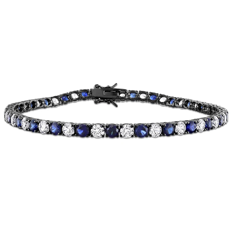 Add style and class to your look with this Created White Sapphire and Created Blue Sapphire Men's Tennis Bracelet. Crafted in Black Rhodium Plated Sterling Silver, this bracelet features 27 round 4mm created white sapphires and 26 round 4mm created blue sapphires. The tennis bracelet fastens onto your wrist with an efficient tongue a groove clasp and secured by a double safety latch.