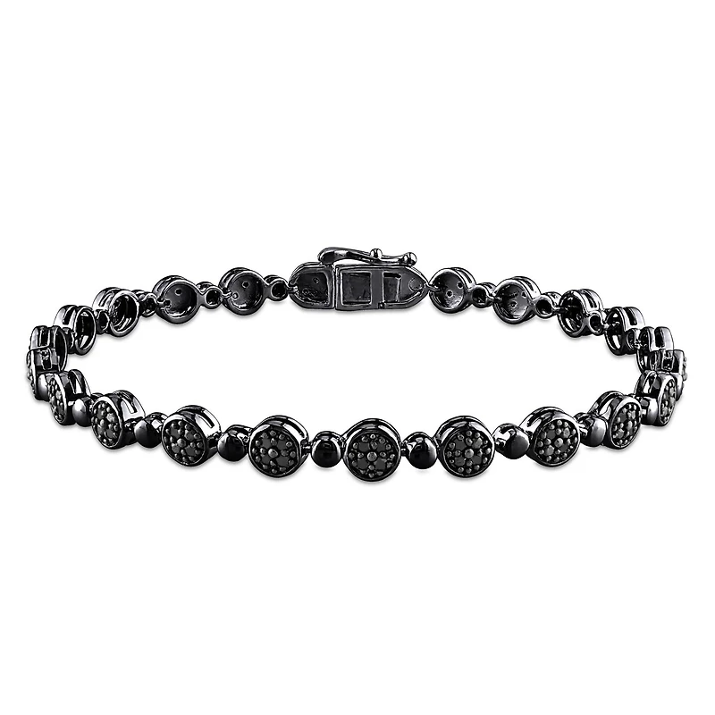 Glam up your outfit with this Black Diamond Tennis Bracelet. Crafted in shining sterling silver, it features 50 round-cut, pave-set diamonds in a tennis pattern for a glorious look. Polished to a brilliant shine, this bracelet measures 7.25-inches in length and secures with a pressure tongue clasp. This gorgeous bracelet can be layered with other bracelets for a chunky premium look. A perfect gift for your beloved on a special occasion.