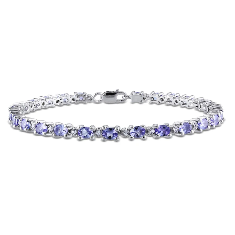 This Sterling Silver Tanzanite and White Topaz Tennis Bracelet is an eye-catching piece for everyday wear. The bracelet shimmers with 26 dazzling oval-cut, prong-set tanzanites (4mm x 3mm) alternating with 26 icy round, prong-set white topaz (1.25mm). Measuring 7 inches in length, the bracelet is secured with a lobster clasp.