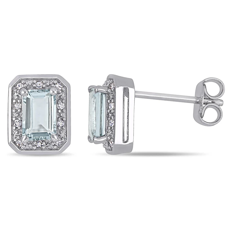 Look fashionable with these stud earrings which features emerald-cut aquamarine stones and round white diamonds. These brilliant earrings are crafted in lustrous sterling silver and are secured with butterfly backs.