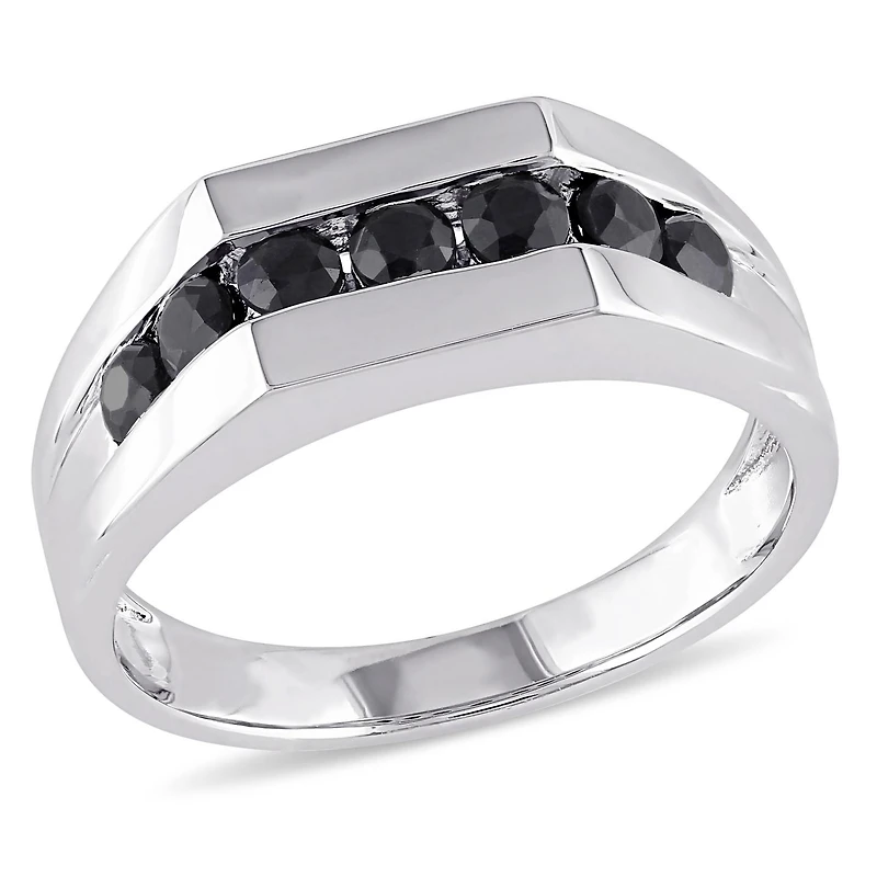 This attractive men's ring features round-cut black sapphire stones set in sterling silver. This extraordinary ring is enhanced with a high polish finish.