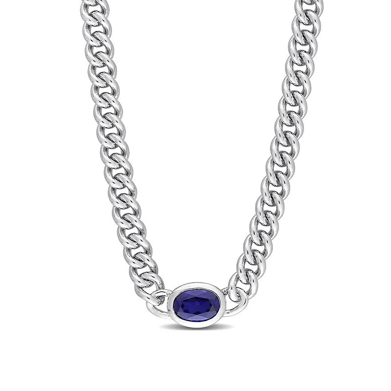 Dazzle everyone with this created blue sapphire solitaire oval curb chain necklace. Crafted in lustrous sterling silver it features an oval-cut, bezel-set created blue sapphire gemstones studded at the centre of the flat curb chain which draws everyone's attention. Buffed with luster, this necklace measures 16-inch in length and secures with a lobster clasp. Pair this gorgeous necklace with any flat curb link chain and complete your look.